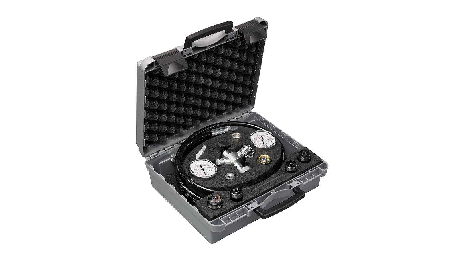 This diagnostic measurement line consists of a full range of miniaturized components for quick pressure checks on hydraulic equipment through test couplings (threaded valves), fitted micro hoses, adapters, and measurement tools and devices.